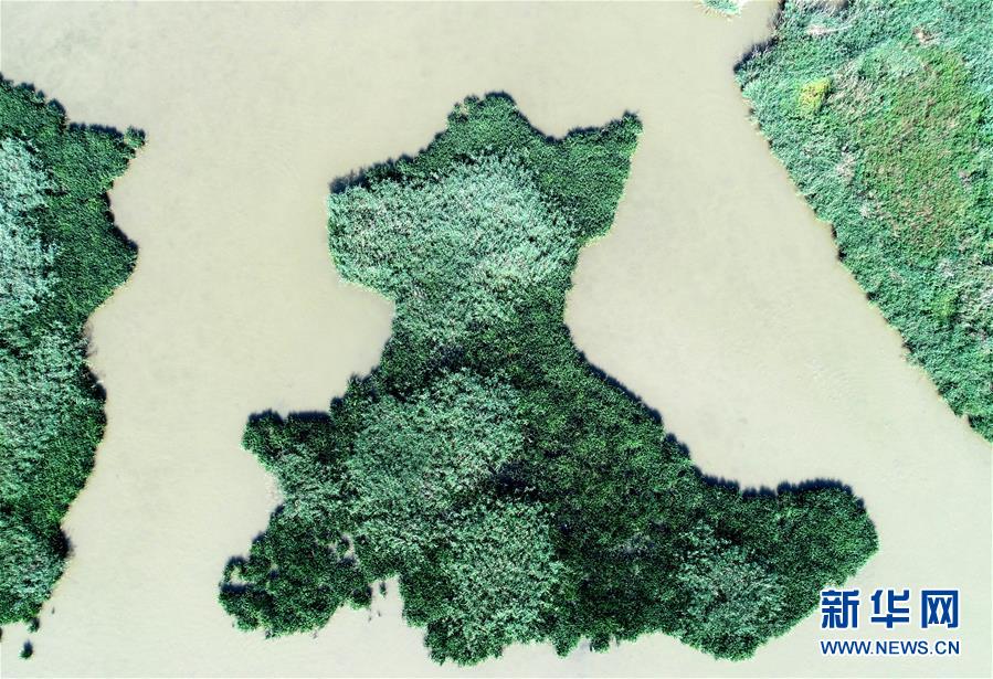 这是天津市宁河区七里海湿地内芦苇和水面形成的图案(6月22日无人机拍摄)。