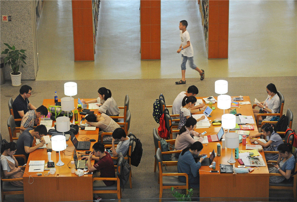 2017年7月7日是24节气中的“小暑”,不少市民来到湖北省图书馆静心阅读,躲避闷热的天气。cfp/视觉中国