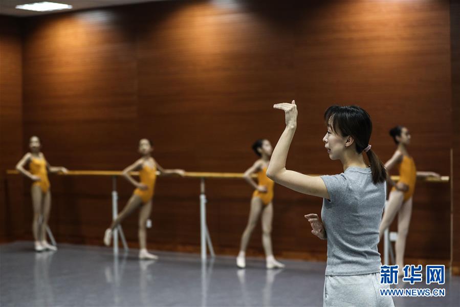 4月12日,辽宁芭蕾舞团附属芭蕾舞蹈学校的老师张梦妮在为一年级的学生上芭蕾基训课。新华社记者 潘昱龙 摄
