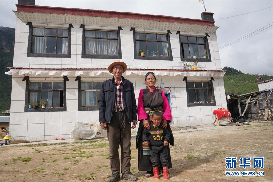 乃村村民次旺多吉、妻子米玛和孙子尕玛多吉在自家新房前合影(8月26日摄)。新华社记者 多吉占堆 摄