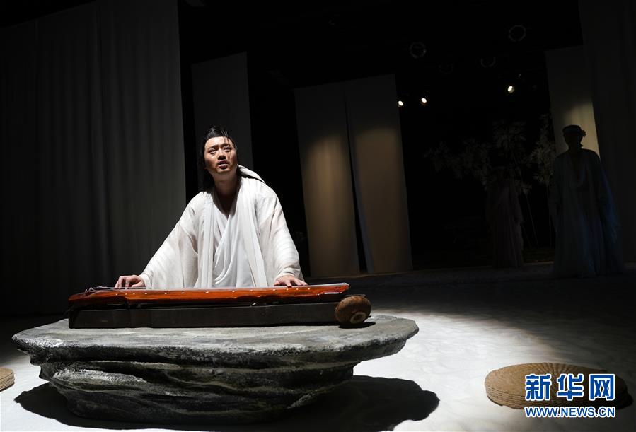 9月16日,演员在话剧《广陵绝》中表演。 当日,话剧《广陵绝》在北京人艺实验剧场上演。该剧由中国戏剧家协会副主席王晓鹰任艺术指导,庞贝编剧,通过魏晋名士嵇康与战国刺客聂政的“同构”拼贴,旨在展现中国传统“道义”精神,反思生命与自由冲突,探讨人的主体意识觉醒。 新华社记者 金良快 摄
