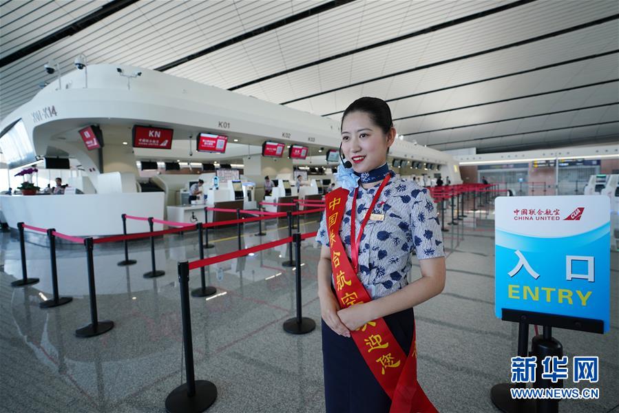 9月25日,中国联合航空公司的工作人员在北京大兴国际机场航站楼内迎接乘客。新华社记者鞠焕宗摄