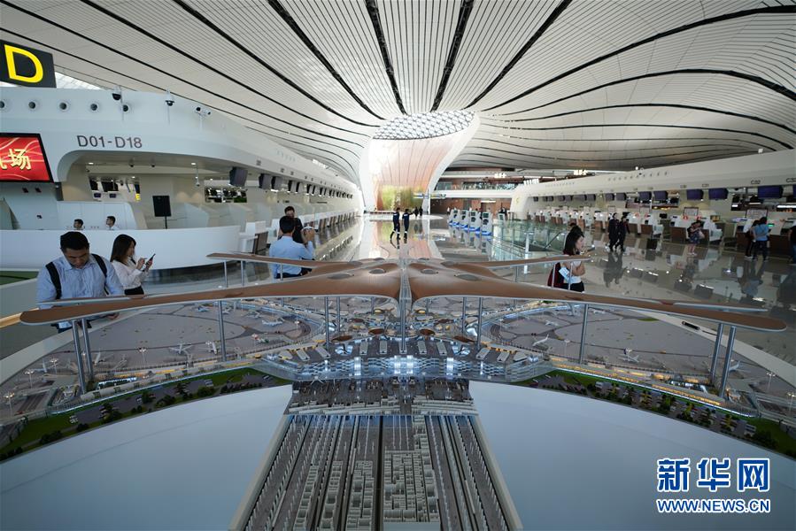 9月25日拍摄的在北京大兴国际机场航站楼内摆放的机场航站楼模型。新华社记者鞠焕宗摄