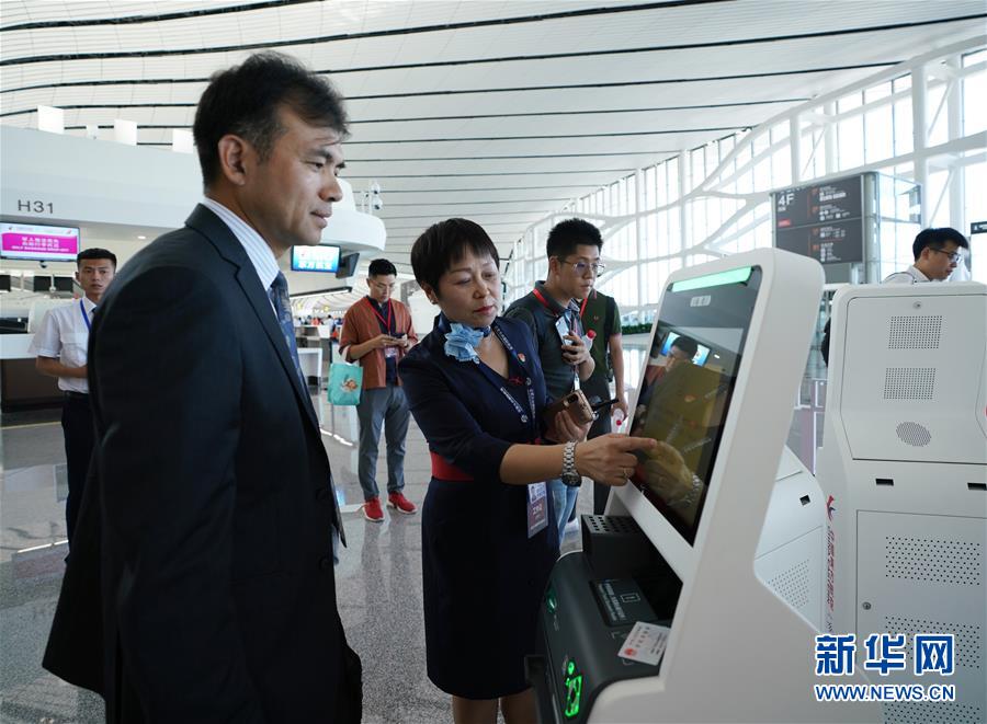 9月25日,中国南方航空公司工作人员(左)在北京大兴国际机场介绍自助行李托运设备。新华社记者鞠焕宗摄