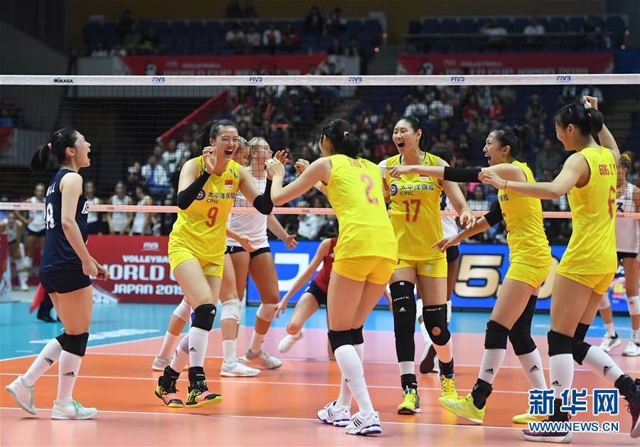 9月23日,中国队球员在比赛中庆祝得分。当日,在日本札幌举行的2019年女排世界杯赛第二阶段A组循环赛中,中国队以3比0战胜美国队。新华社记者贺灿铃摄