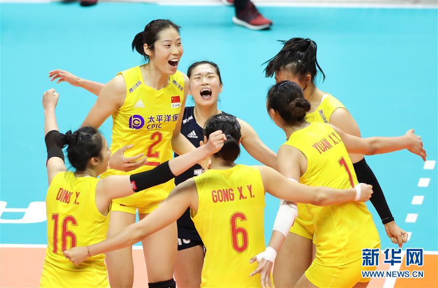 9月23日,中国队球员在比赛中庆祝得分。当日,在日本札幌举行的2019年女排世界杯赛第二阶段A组循环赛中,中国队以3比0战胜美国队。新华社记者杜潇逸摄