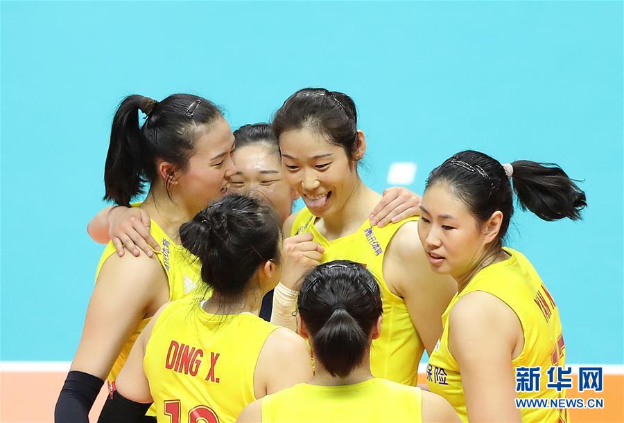 9月23日,中国队球员朱婷(中)在得分后庆祝。当日,在日本札幌举行的2019年女排世界杯赛第二阶段A组循环赛中,中国队以3比0战胜美国队。新华社记者杜潇逸摄