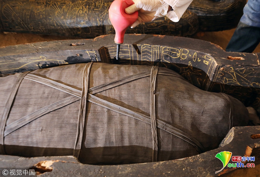 当地时间2018年11月24日,埃及卢克索,考古学家在当地发掘出一处墓穴,在其中发现石棺、木乃伊等文物,时间可追溯至公元前4-7世纪。