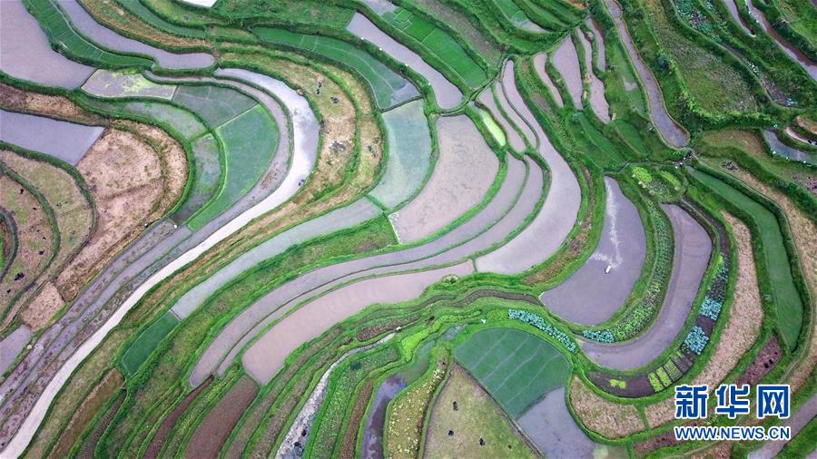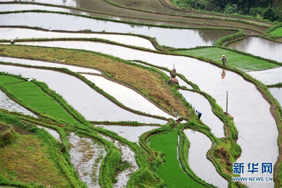 5月18日,农民在贵州省丹寨县龙泉镇高要梯田里劳作。初夏时节,位于贵州省丹寨县龙泉镇的高要梯田景色优美。新华社记者杨文斌摄