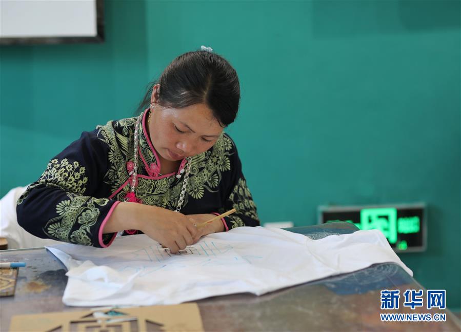7月2日,苗族妇女王尖其在丹寨万达小镇展示苗族蜡染技艺。新华社记者欧东衢摄