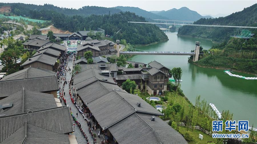 7月2日,游客在丹寨万达小镇游览(无人机拍摄)。新华社记者欧东衢摄