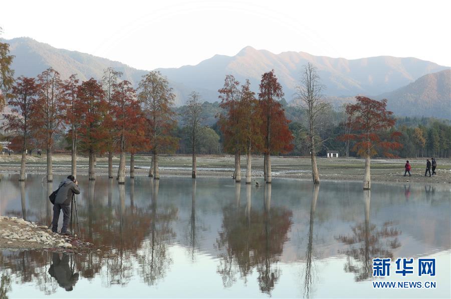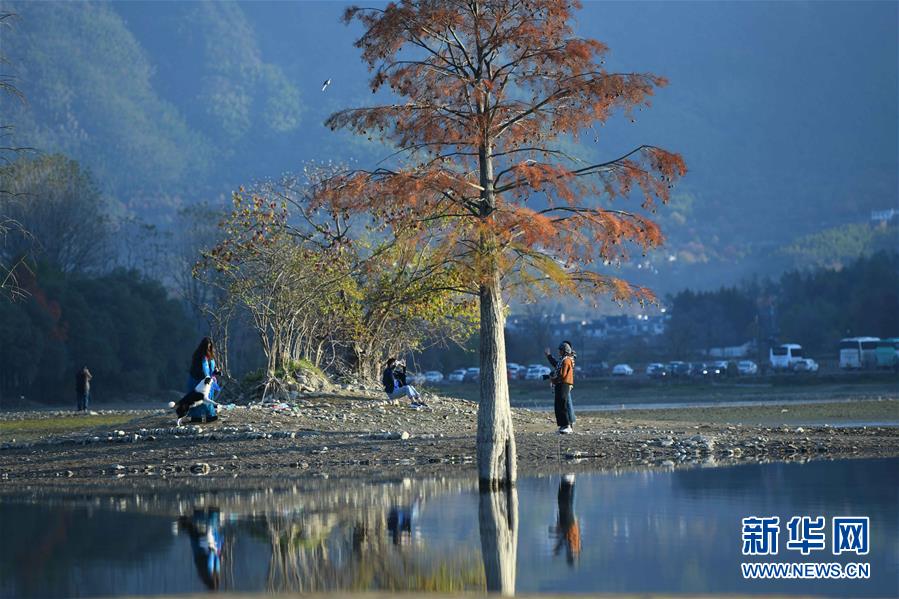 11月14日,一名游客在安徽黟县奇墅湖拍照。新华社记者韩晓雨摄