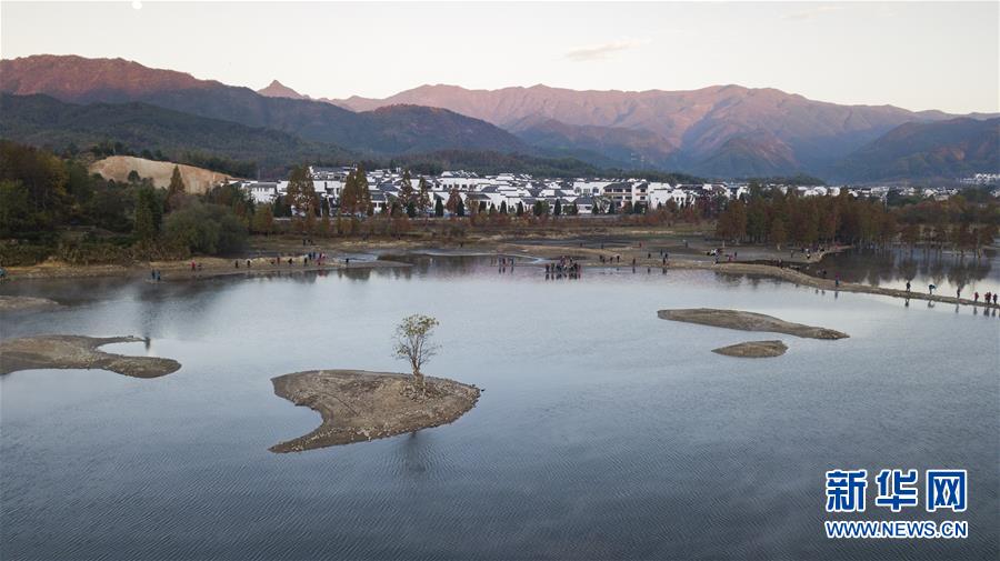 11月14日无人机拍摄的安徽黟县奇墅湖晨景。新华社记者张端摄