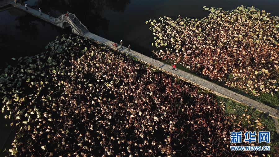 11月14日,游客在奇墅湖边拍照(无人机拍摄)。新华社记者张端摄