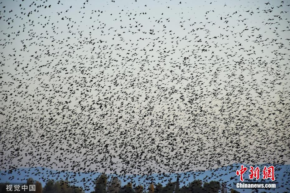 近日,土耳其穆什,椋鸟群迁徙途中,黑压压一片遮挡天空。图片来源:视觉中国