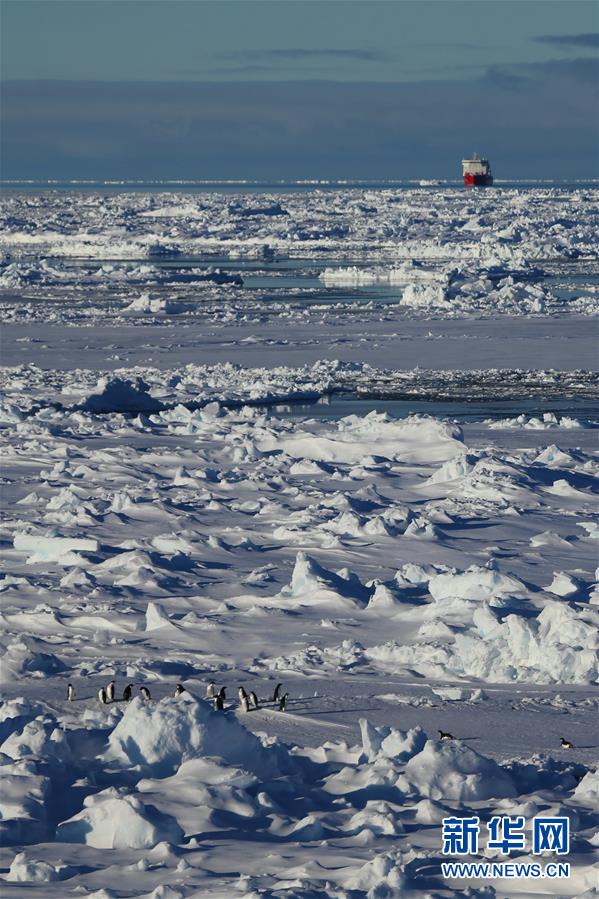从“雪龙2”号上拍摄的企鹅群和“雪龙”号(11月19日摄)。新华社记者刘诗平摄