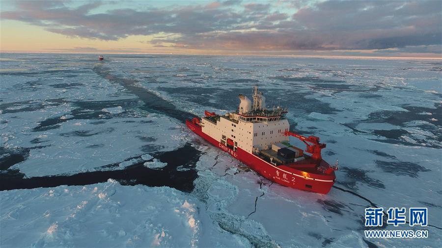 航行在南极圈内浮冰区的“雪龙2”号和“雪龙”号(11月19日无人机拍摄)。新华社记者刘诗平摄