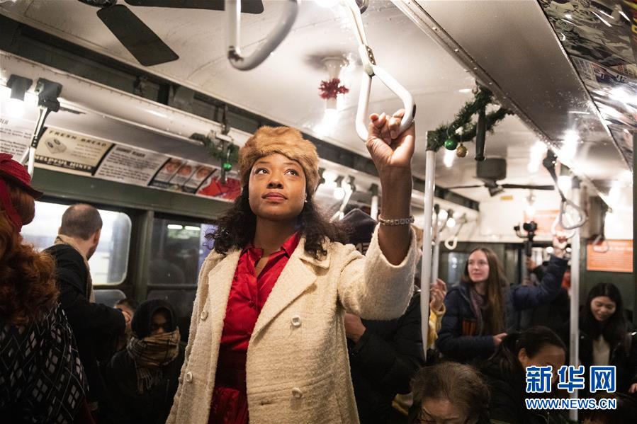 12月8日,在美国纽约,人们搭乘“怀旧专列”。每年感恩节到新年之间的星期日,纽约地铁都会用1932年至1977年间使用的老式列车在运营的线路上开行特别的“怀旧专列”,人们穿戴旧时服饰专程前来搭乘,体验时光回溯的奇妙旅程。新华社记者王迎摄