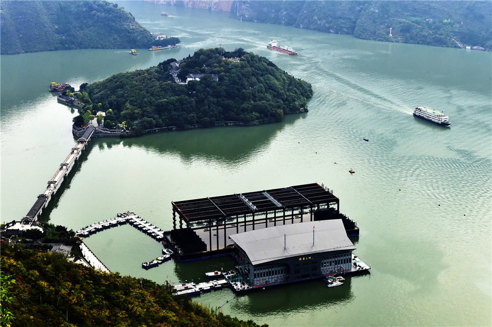 2019年11月3日,位于重庆市奉节县长江三峡入口处、夔门正前方的白帝城再现“孤岛景观”。这座曾经雄踞山之峰峦的三国历史文化名城随着三峡工程175米实验性蓄水完成,仅凭一处风雨廊桥可以通过。图为2019年11月3日,重庆,四面环水的“白帝城孤岛”风貌,各种豪华游轮陆续驶往宝塔坪旅游码头,供游客们登岛参观。饶国君/视觉中国