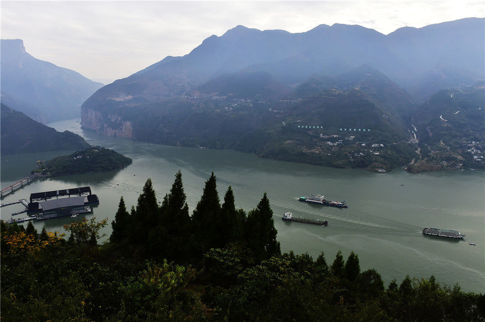 2019年11月2日,重庆,各种上行船舶正在通过白帝城前方的三峡夔门,蓄水后货畅其流、往来无阻的水运业彰显“黄金水道”的社会效益。