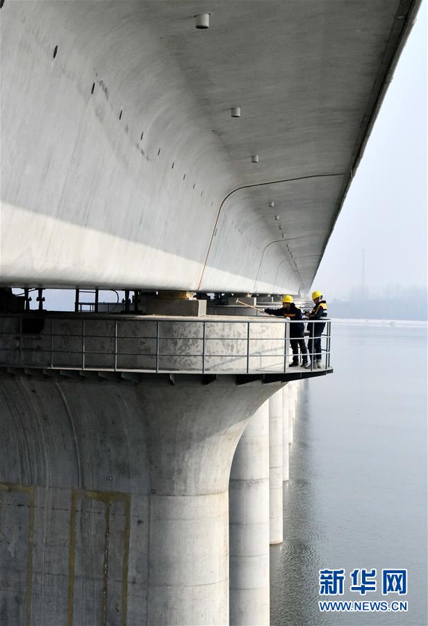 1月3日,中国铁路济南局临沂工务段工程技术员在沂河特大桥桥墩上检查。新华社记者 朱峥摄