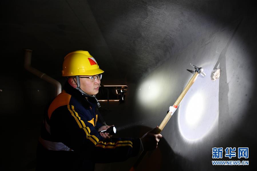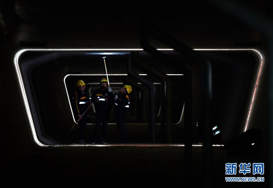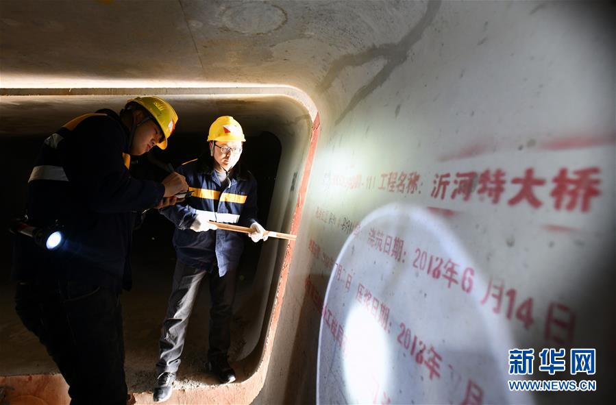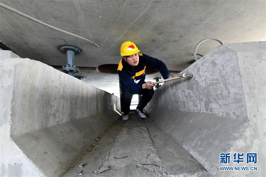 1月3日,中国铁路济南局临沂工务段工程技术员在沂河特大桥箱梁内检查。新华社记者 朱峥摄