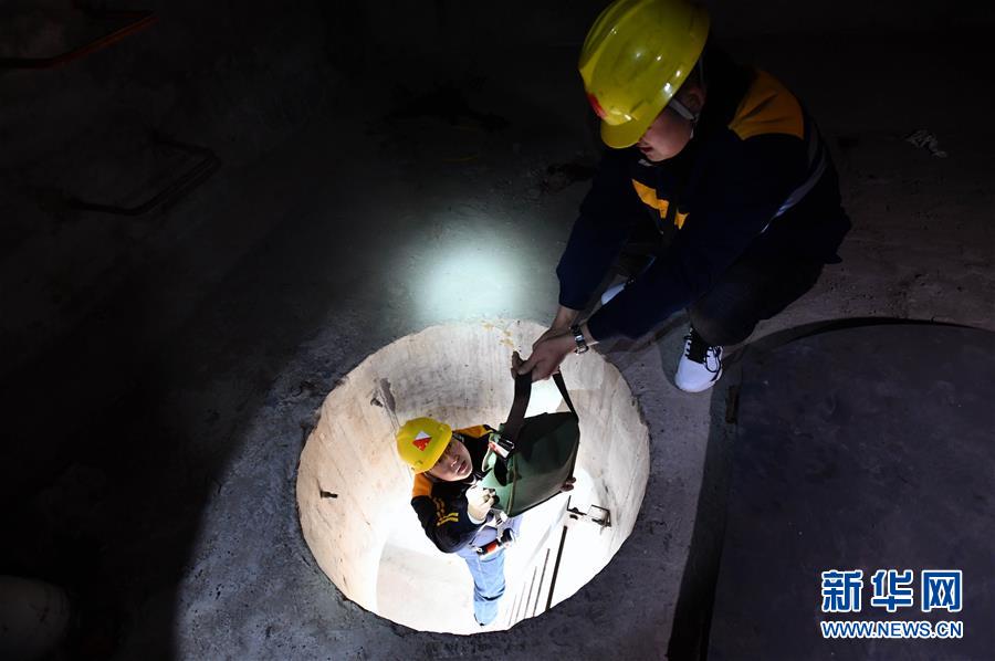 1月3日,中国铁路济南局临沂工务段工程技术员通过狭小的检查孔进入箱梁检查。新华社记者 朱峥摄