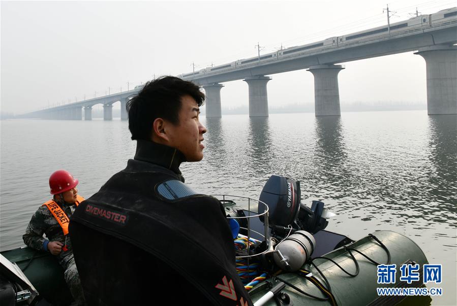 1月3日,潜水员李壮看着飞驰而过的列车准备潜水检查桥墩。新华社记者 朱峥摄