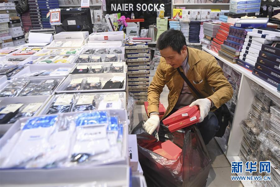 冉光辉在重庆朝天门大正商场内整理即将搬运的货物(1月5日摄)。新华社记者王全超摄