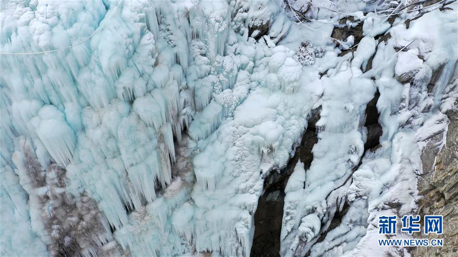 这是1月7日拍摄的贺兰山岩画景区内的冰瀑景观(无人机照片)。近日,宁夏贺兰山岩画景区内,自然山泉冻结冰瀑和人造冰瀑景观相结合,形成多处冰瀑景观,山间形态各异的冰挂、冰柱鬼斧神工,蔚为壮观,吸引众多游客前来观赏。 新华社记者 王鹏 摄