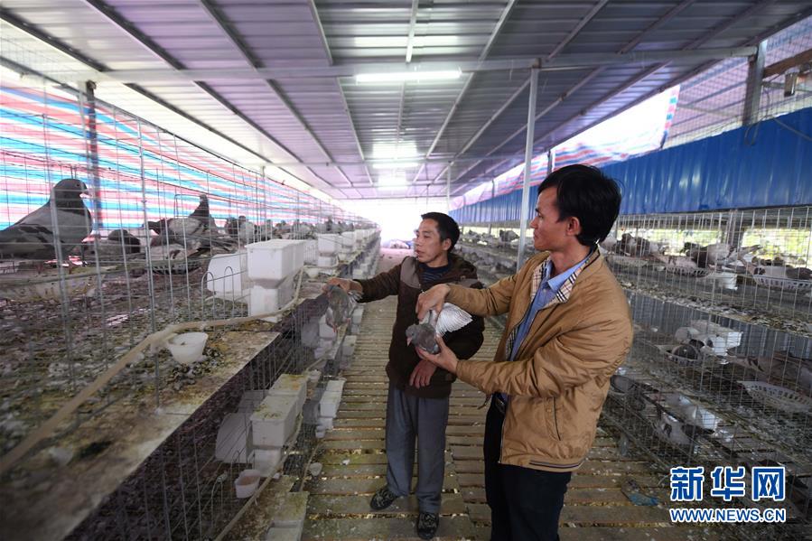八好村驻村第一书记韦德王(右)在扶贫养殖场了解乳鸽的生长情况(2019年12月16日摄)。新华社记者黄孝邦摄