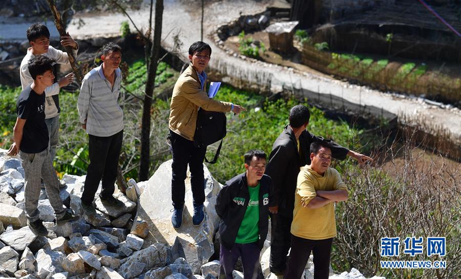 八好村驻村第一书记韦德王(中)在弄豪屯推进水柜项目建设进度(2019年12月16日摄)。新华社记者黄孝邦摄