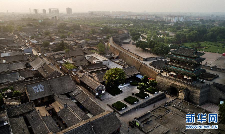 这是7月20日无人机拍摄的平遥古城墙与护城河。平遥古城城墙总周长6163米,墙高约12米,把面积约2.25平方公里的平遥县城隔为两个风格迥异的世界。城墙以内街道、铺面、市楼保留明清形制,城墙以外为新城。