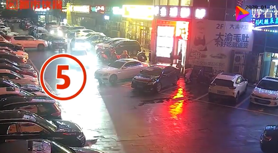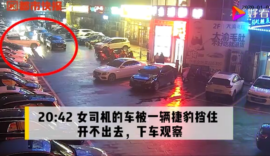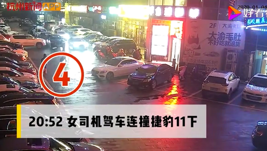 通过监控发现,捷豹车当时并没有停在停车位上,而是横着停在停车位前的通道上,正好挡住了停在停车位里面的车辆。晚上8点40左右,一辆白色丰田普拉多越野车被捷豹挡住无法出去,10多分钟后,司机通过倒车再加速十几次撞击捷豹,最终把车辆撞开后驶离现场。