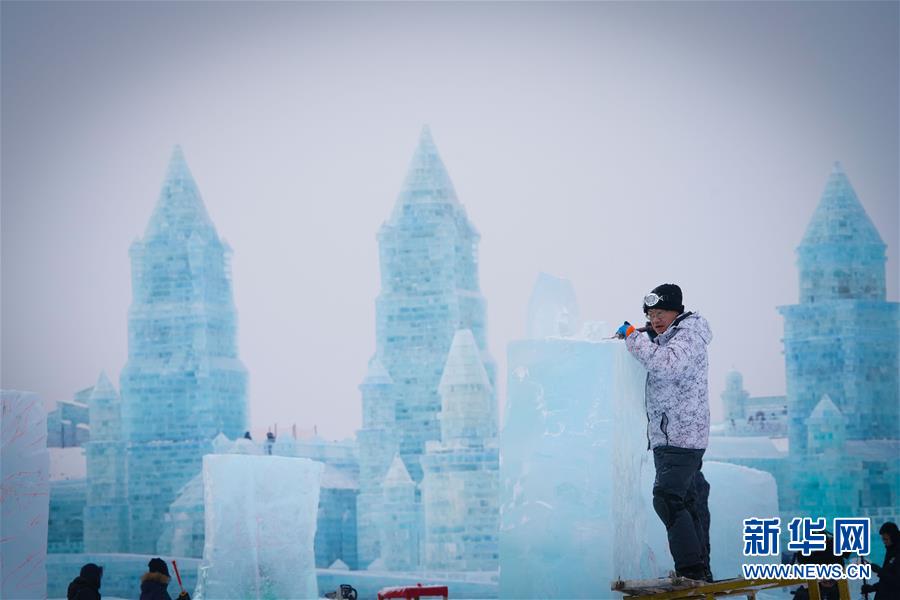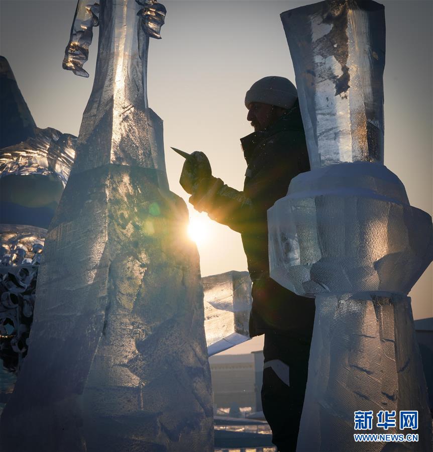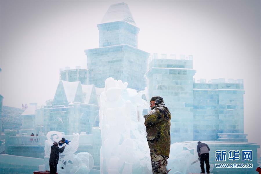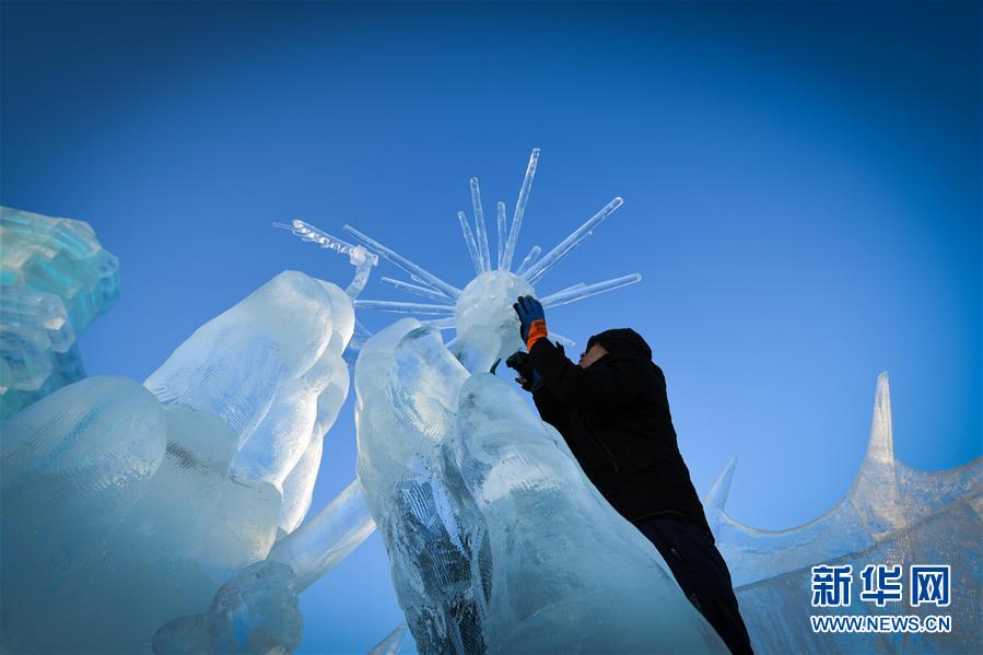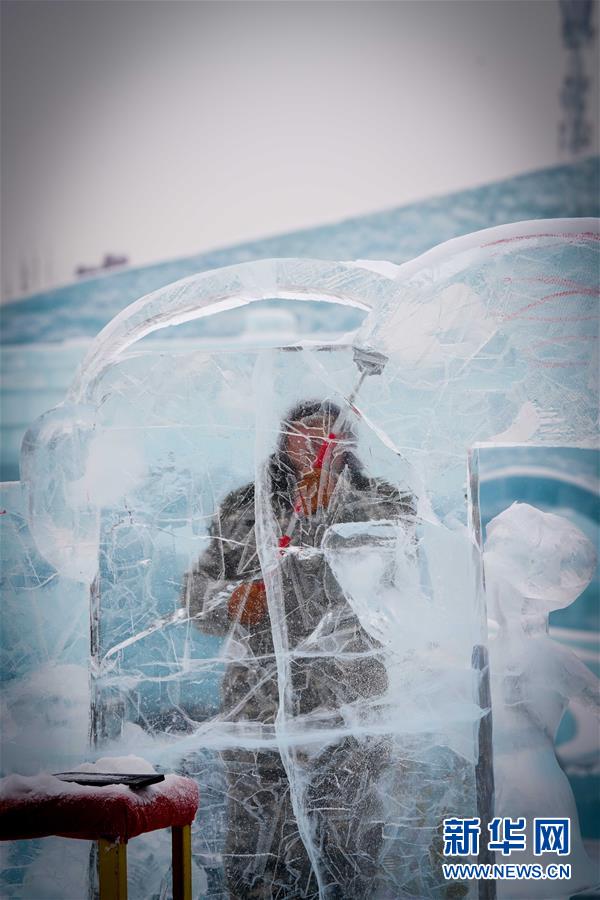 第九届中国·哈尔滨国际组合冰雕比赛选手在哈尔滨冰雪大世界内制作冰雕(1月2日摄)。新华社记者王松摄