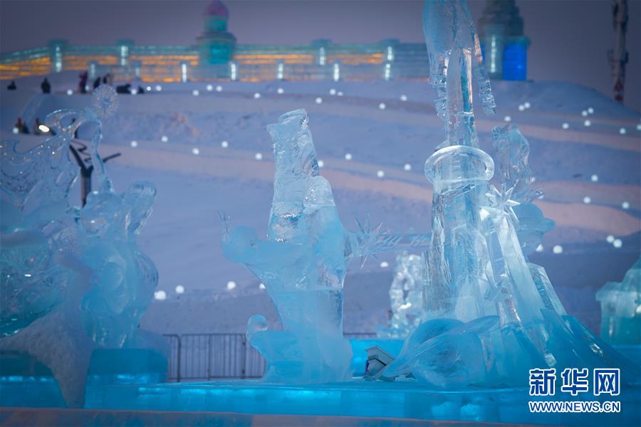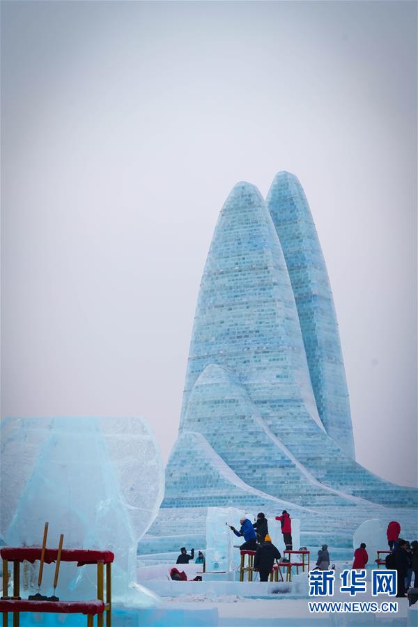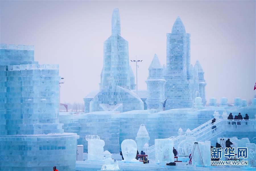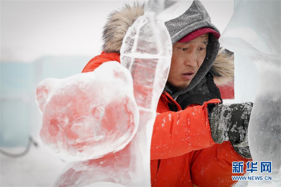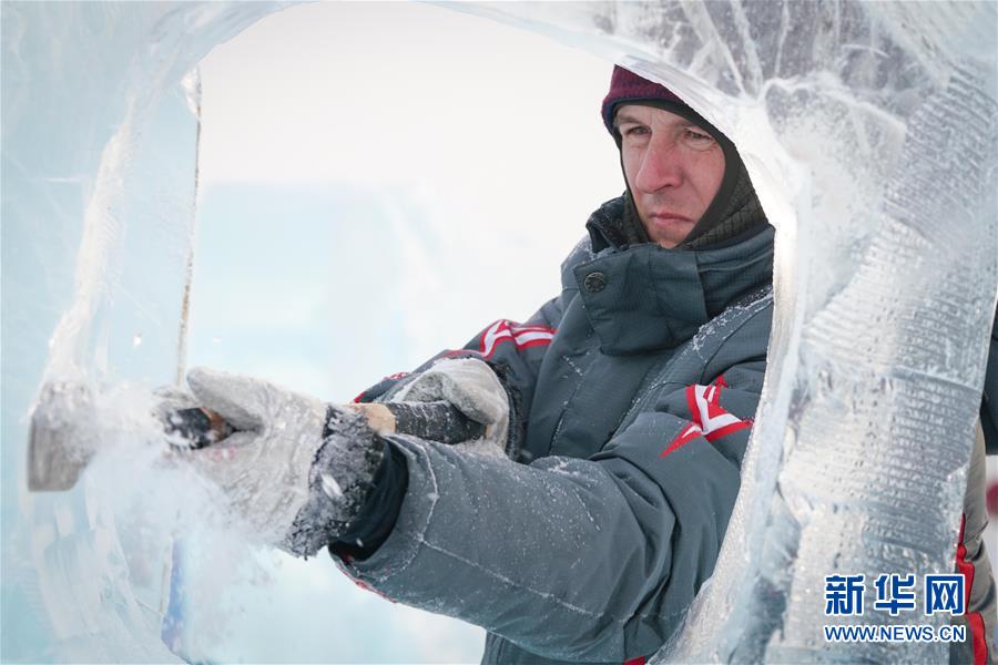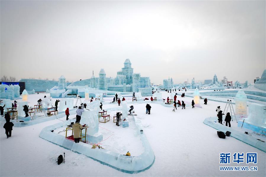 第九届中国·哈尔滨国际组合冰雕比赛选手在哈尔滨冰雪大世界内制作冰雕(1月2日摄)。新华社记者王松摄