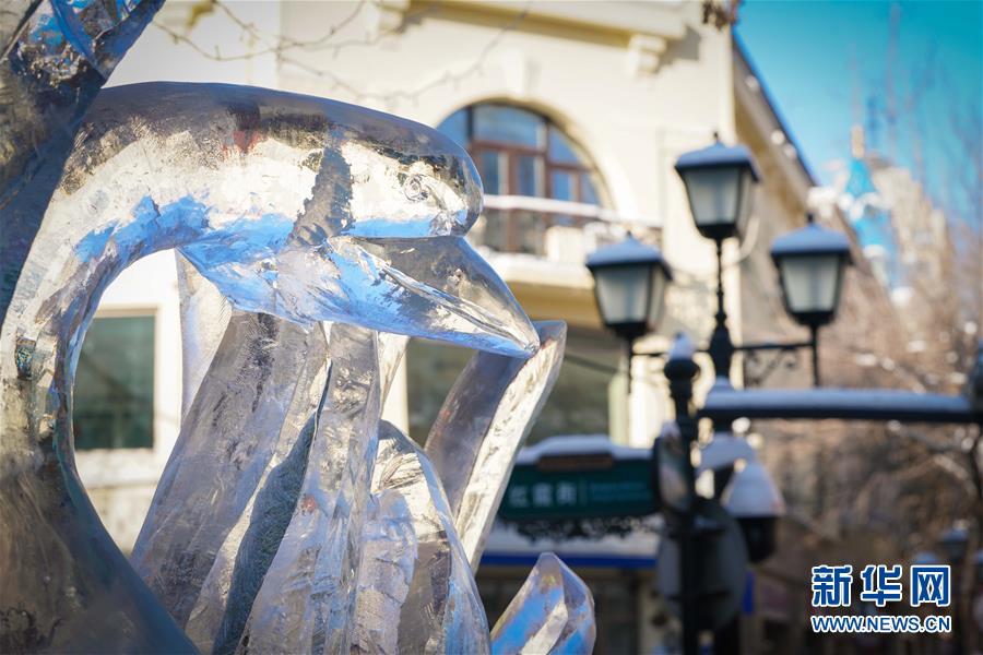这是哈尔滨中央大街上的冰雕作品(1月1日摄)。新华社记者王松摄