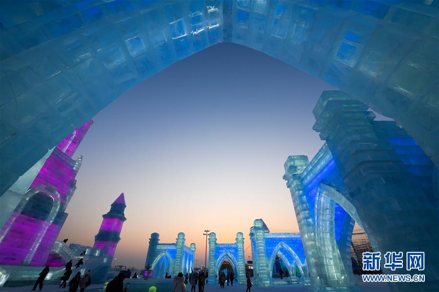这是哈尔滨冰雪大世界园区中的景观(1月5日摄)。每到冬季,天气寒冷的冰城哈尔滨陆续迎来各类冰雕雪雕赛事。从2019年12月7日起,采冰工人们日夜采冰运冰、冰景雪雕艺术家精心雕琢,这些“冰雪造梦者”们在严寒天气中辛苦付出,让一座“冰雪之城”在松花江畔拔地而起,向来自世界各地的游客展现浪漫绚丽的冰雪奇观。新华社记者王松摄