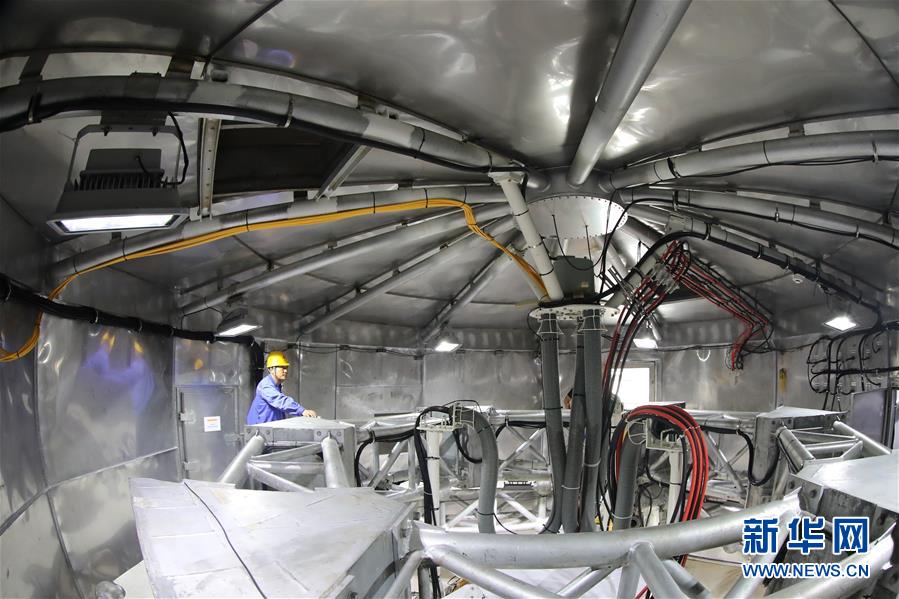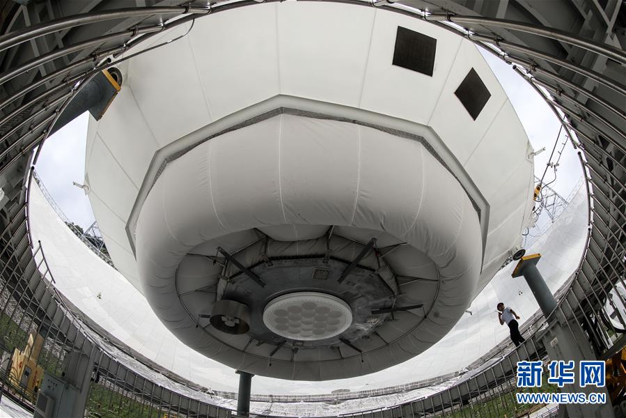 8月28日,工作人员在FAST馈源舱内进行检修。新华社记者欧东衢摄