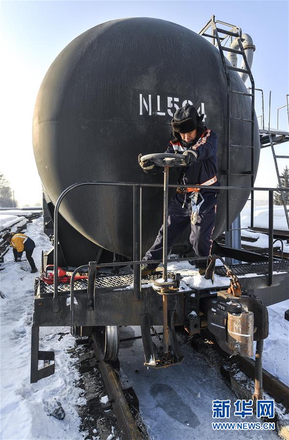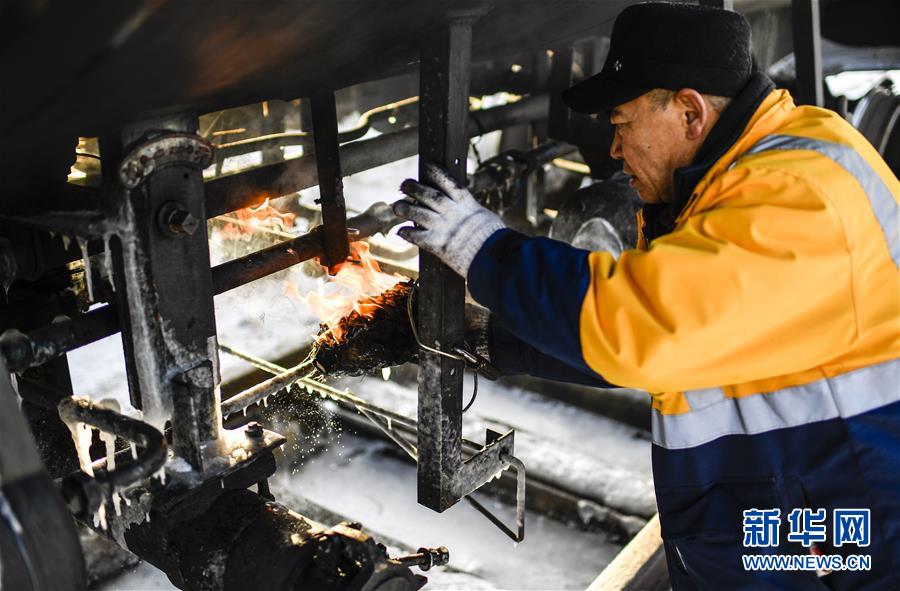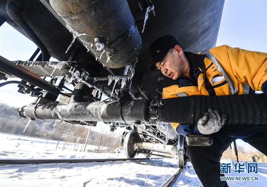 林海间的“送水小火车”调车员对“送水小火车”进行出行前的检查作业(1月17日摄)。新华社记者许畅摄