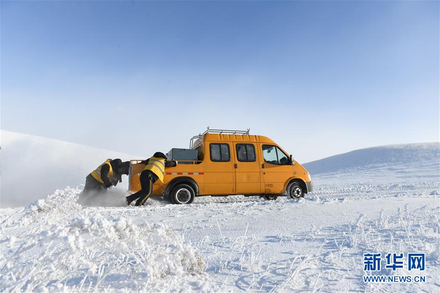 1月13日,车辆在途中打滑,白音库伦综合维修车间的职工推车前行。新华社记者刘磊摄