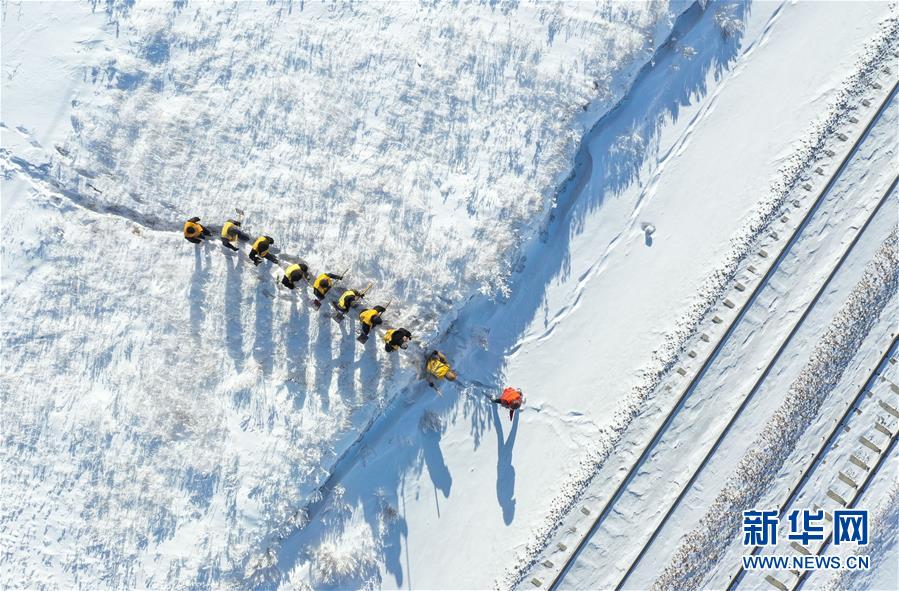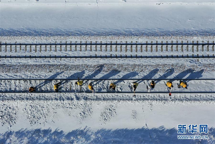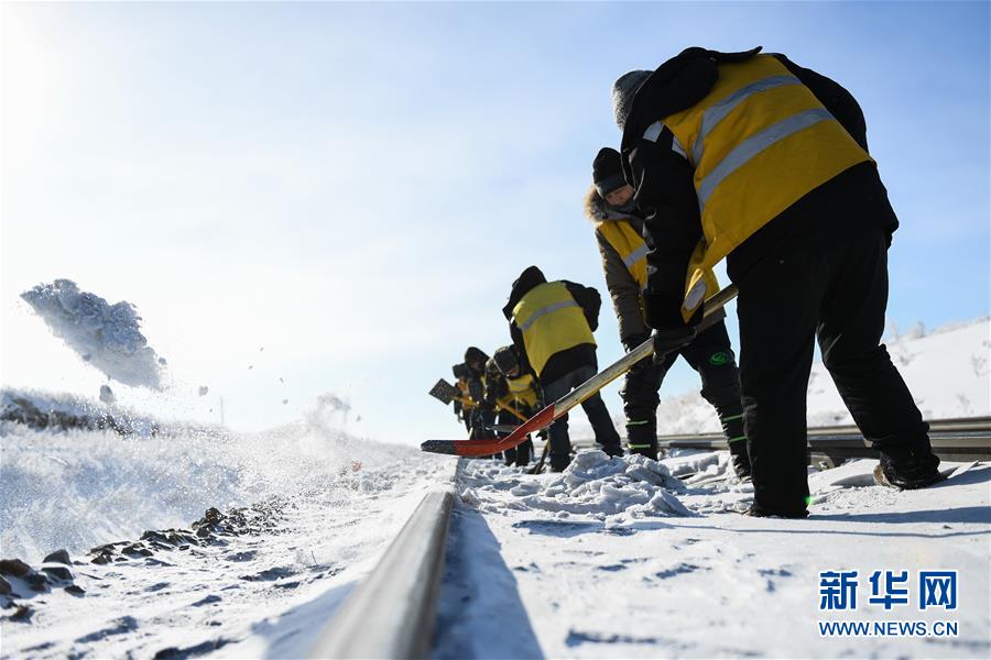 1月13日,白音库伦综合维修车间职工在作业点清理积雪。新华社记者刘磊摄