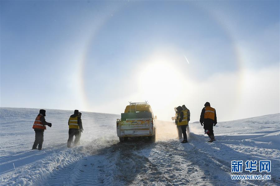 1月13日,车辆在途中打滑,白音库伦综合维修车间的职工们查看路况。新华社记者刘磊摄