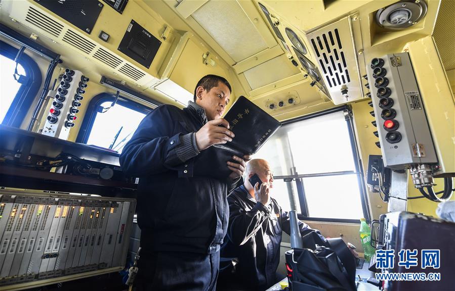 机车司机杜洪峰(右)与副司机谢振国进行开车前的例行检查(1月17日摄)。新华社记者许畅摄