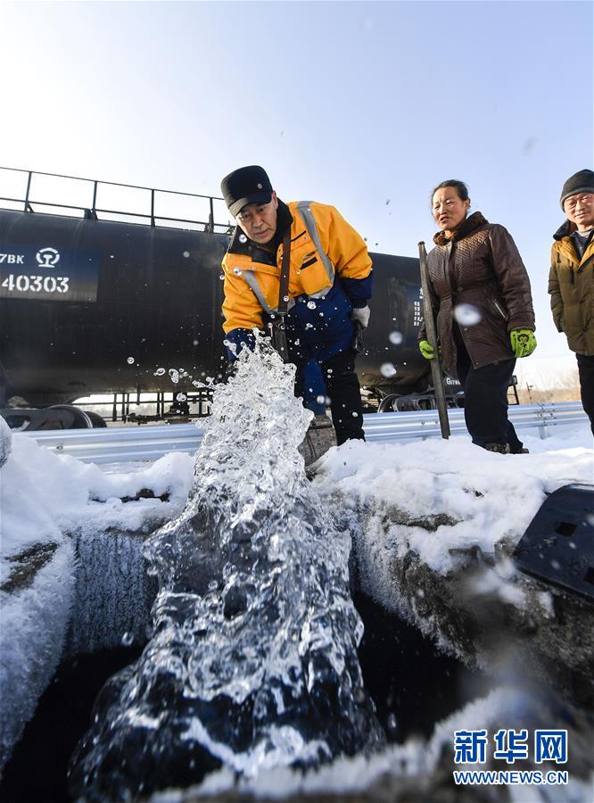 因为冬季温度过低,送水员黄卫东在蓄水前需要提前加热阀门(1月17日摄)。新华社记者许畅摄