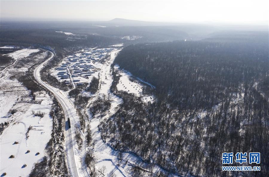 “送水小火车”行驶在林海间,前往送水地点(1月17日摄,无人机照片)。新华社记者许畅摄