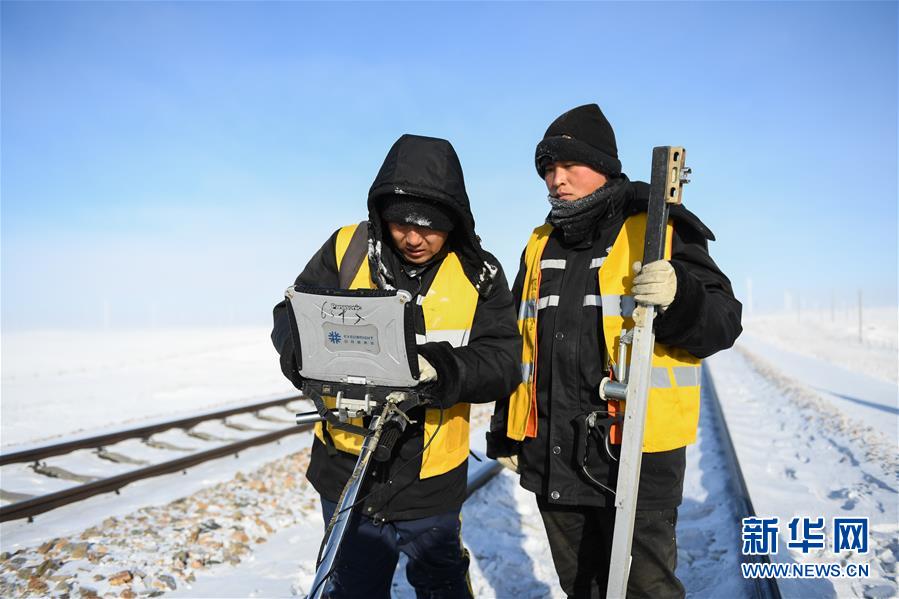 1月13日,白音库伦综合维修车间职工操作仪器检查铁轨。新华社记者刘磊摄