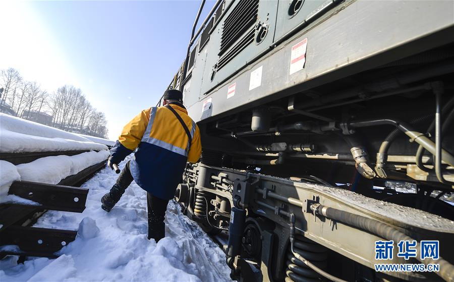 送水员黄卫东在雪地中前行,准备登上火车前往送水地点(1月17日摄)。新华社记者许畅摄