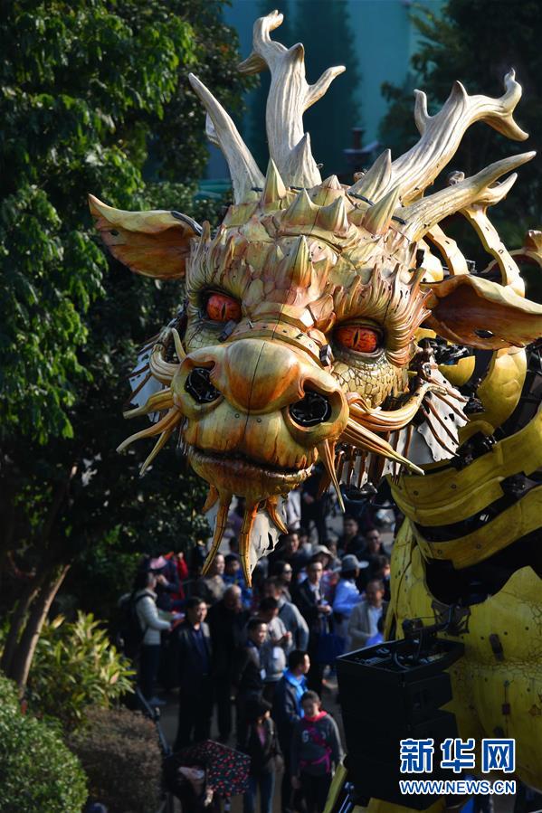 1月18日,大型机械装置艺术品“龙马精神”在珠海长隆海洋王国巡游展示。新华社记者 刘大伟 摄