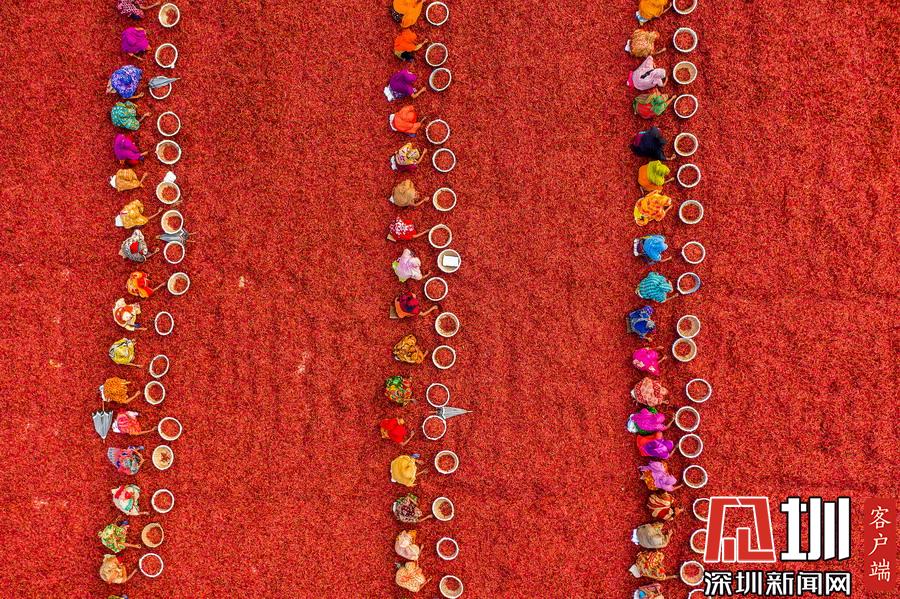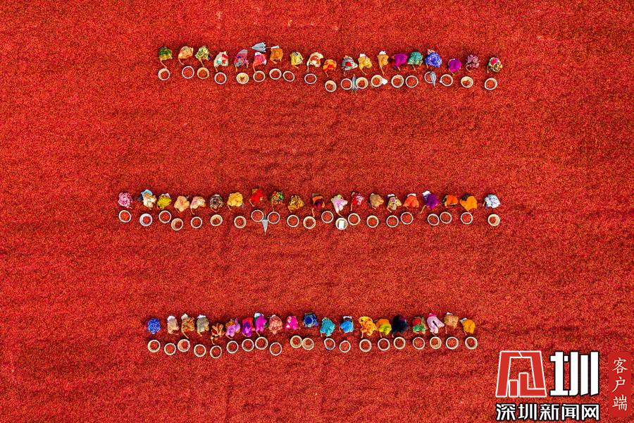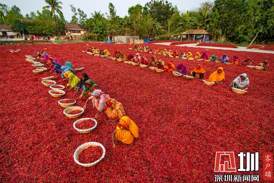 孟加拉国伯格拉,航拍穿着五颜六色衣服的工人们排列整齐的分拣辣椒。